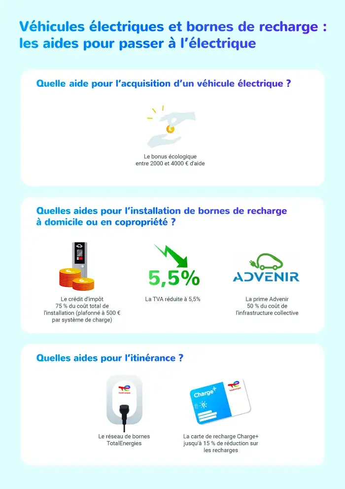 Vous hésitez encore à franchir le pas vers la mobilité électrique ? Bonne nouvelle : l'État met le turbo sur les aides pour vous faciliter la transition ! Bonus écologique, crédit d'impôt, TVA réduite à 5,5 %... Que ce soit pour l'achat d'un véhicule électrique, l'installation d'une borne à domicile ou la recharge en itinérance, de nombreux dispositifs sont là pour vous accompagner.
